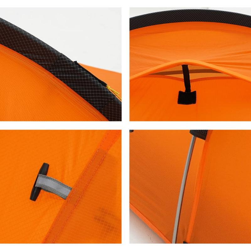 Materials, construction, and durability : Made from high-density 15D nylon fabric and protected by a double-sided waterproof coating, the tent guarantees excellent weather protection. Its lightweight aluminum frame, supported by 6 anchor points and secured with 16 stakes and 12 guy lines, ensures remarkable stability, even in harsh weather conditions. So you can camp with complete peace of mind and face storms without worry.