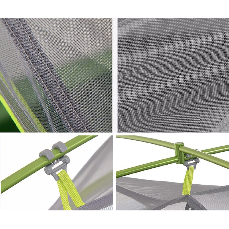 Construite d'un nylon 20D ultra-léger, d'une structure renforcée en aluminium et possédant un double toit avec indice d'imperméabilité de 4000 mm, elle est conçue pour résister à la pluie et aux vents forts, vous procurant ainsi confort et sécurité.